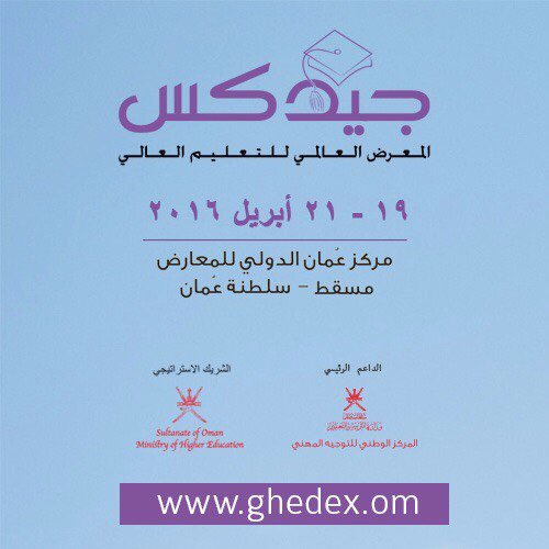 ندعوكم لزيارة ركن المركز الوطني للتوجيه المهني بالمعرض العالمي للتعليم العالي ( جيدكس2016م ) في مركز عمان الدولي للمعارض في الفترة من (19-21/4/2016م) من الساعة  9:30 صباحاً وإلى الساعة 1 مساءً ومن الساعة 4:30 مساءً إلىالساعة 9 مساءً.
