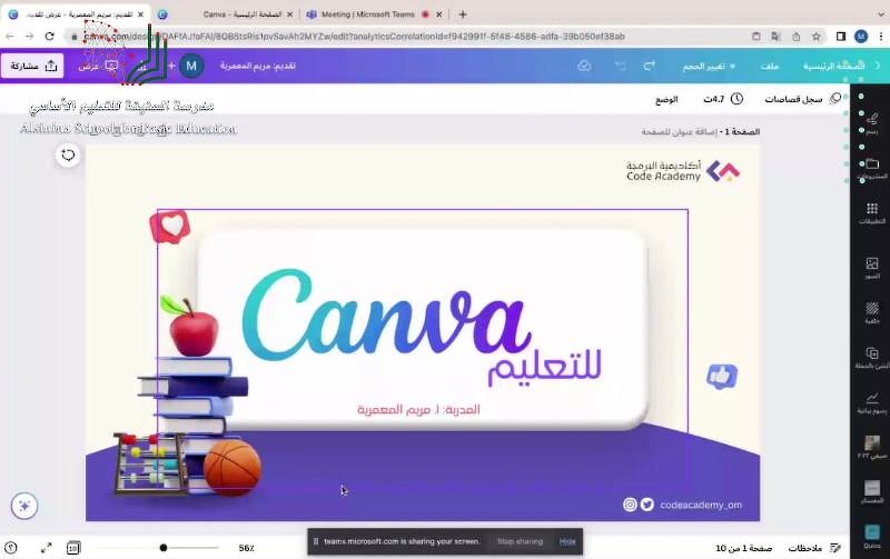 المزيدنفّذ كل من فريق مبادرة مدرستي تبرمج بمدرسة السنينة للتعليم الأساسي ومبادرة رواد التكنولوجيا بمدرسة صعراء للتعليم الأساسي بمحافظة البريمي وبالتعاون مع أكاديمية البرمجة ورشة التصميم باستخدام كانفا (Design using Canva) عبر تقنية الاتصال المرئي قدمتها مريم المعمرية مدربة معتمدة من أكاديمية البرمجة تطرقت فيها إلى التعرف على أساسيات كانفا واسرار تصميم العروض التقديمية وتطبيق عملي على تصميم الشهادات وتصميم الإعلانات. وتهدف المبادرة إلى خلق بيئة تعليمية مناسبة لجميع معلمي المدارس وتعزيز التقنيات الحديثة وتوظيفها لدى المعلمين واكسابهم المهارات اللازمة لمواكبة التطور المتسارع في العالم بالإضافة إلى ...