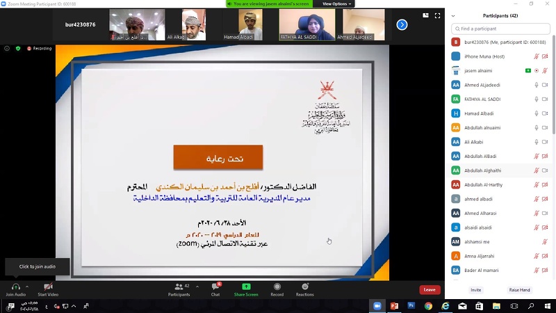 المزيدتحت رعاية الدكتور أفلح بن أحمد بن سليمان الكندي مدير عام المديرية العامة للتربية والتعليم بمحافظة الداخلية وبحضور الدكتورة فتحية بنت خلفان بن سليمان السدّية المديرة العامة دشنت تعليمية البريمي البرنامج الصيفي للموظفين وأعضاء الهيئات الإدارية والتدريسية وطلبة المدارس بعنوان (مستمرون لأجلكم) عبر تقنية الاتصال المرئي (zoom). بدأ حفل التدشين بالقرآن الكريم ثم قدمت الدكتورة المديرة العامة كلمة قالت فيها يعتبر البرنامج الصيفي لطلبة المدارس والموظفين والهيئات الإدارية والتدريسية والوظائف المساندة بالمدارس استمرارا لجهود الوزارة في تقديم رسالتها التربوية التعليمية وتعزيزا لأدوارهم المجتمعية خارج ...