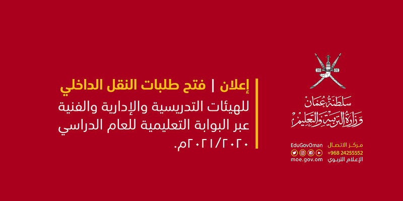 المزيديسر قسم التعيينات والتنقلات بتعليمية البريمي افادتكم بأنه سيتم فتح باب استقبال طلبات النقل الداخلي للعام الدراسي القادم (٢٠٢٠/٢٠٢١م) لأعضاء الهيئة التدريسية والوظائف المرتبطة بها، وذلك خلال الفترة: من تاريخ 5 مارس 2020م إلى تاريخ 30 مارس 2020م علماً بأنه سيتم النقل الداخلي وفق أسس وضوابط النقل كما جاء به القرار الوزاري رقم(154/2016) وتعديلاته.